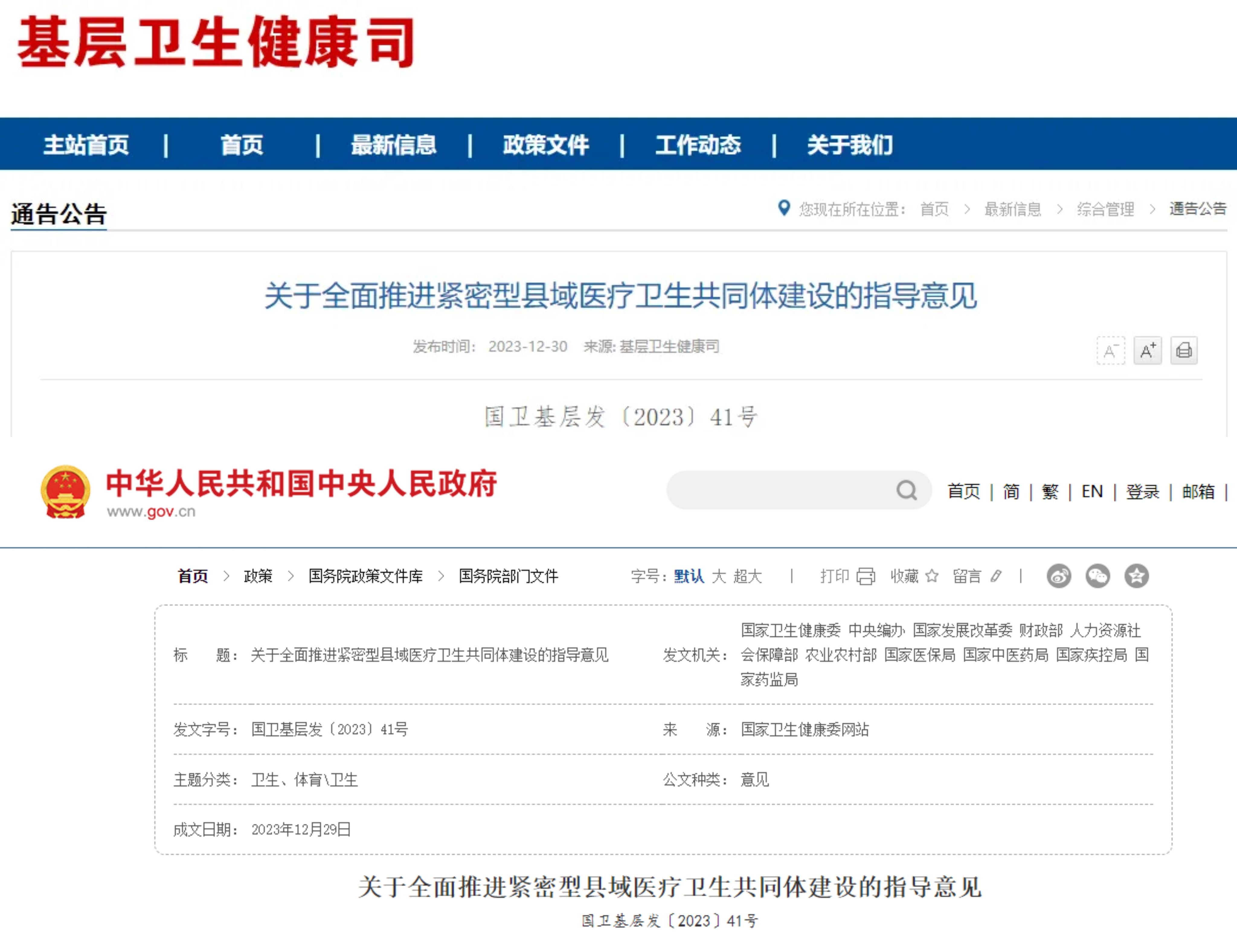 自2019年开始,国家卫健委启动了紧密型县域医共体建设的试点工作,2023年底,国家卫生健康委等10部门联合发布《关于全面推进紧密型县域医疗卫生共同体建设的指导意见》。