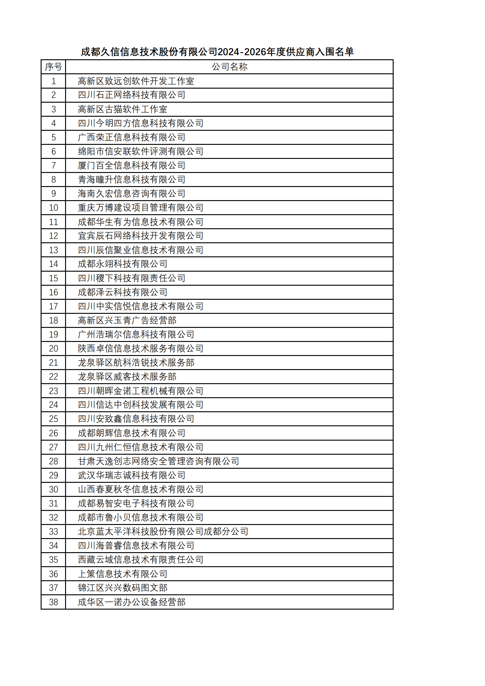 2024年5月10日,久信股份“关于2024-2026年度供应商入围项目”投标工作按照招标文件相关要求进行了公开评比,共有60家单位参与此次入围评比,经过公司管理层严格审查评比,最终共有38家单位入围项目,现将名单予以公布(名单见下方表格,排名不分先后)。