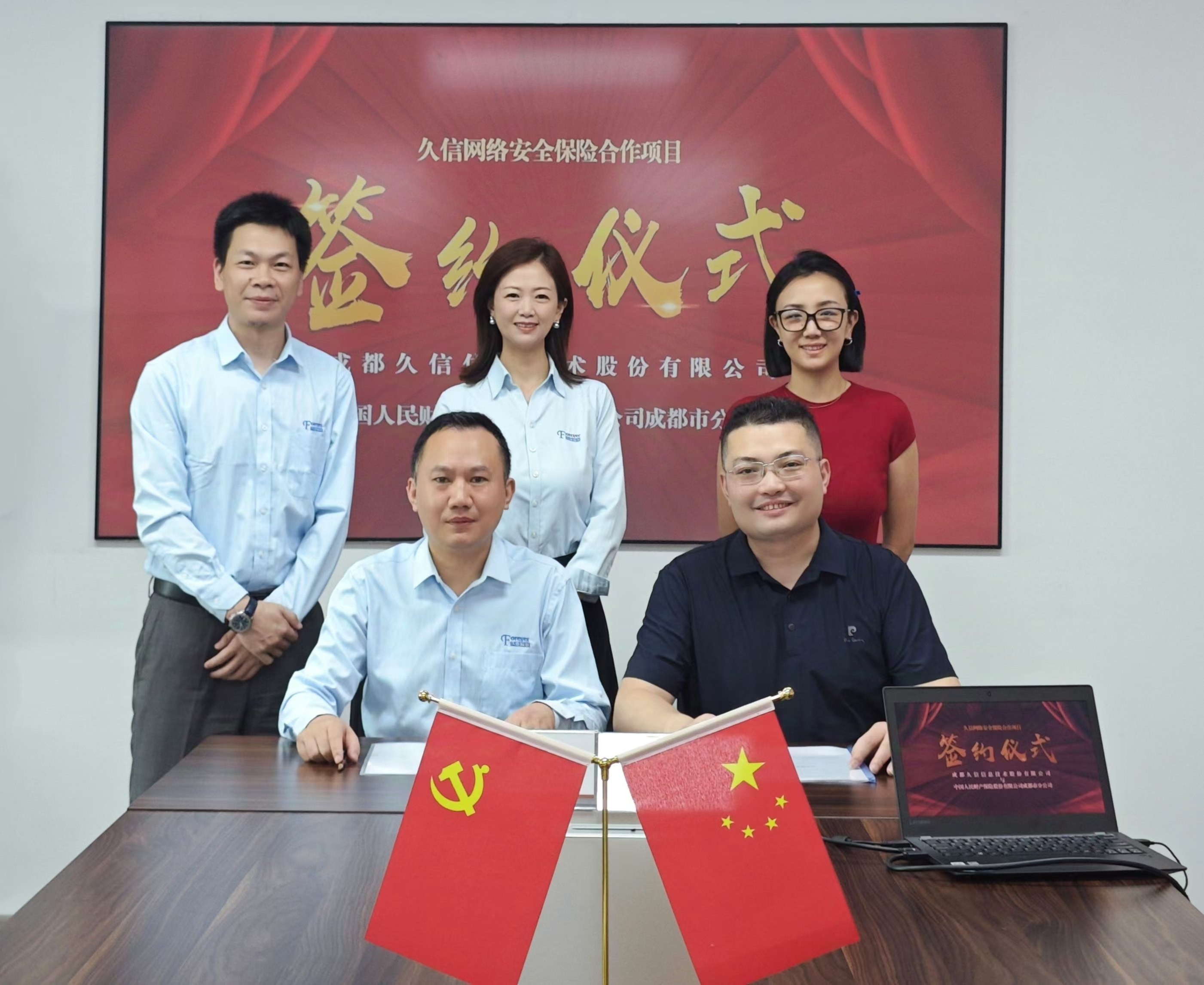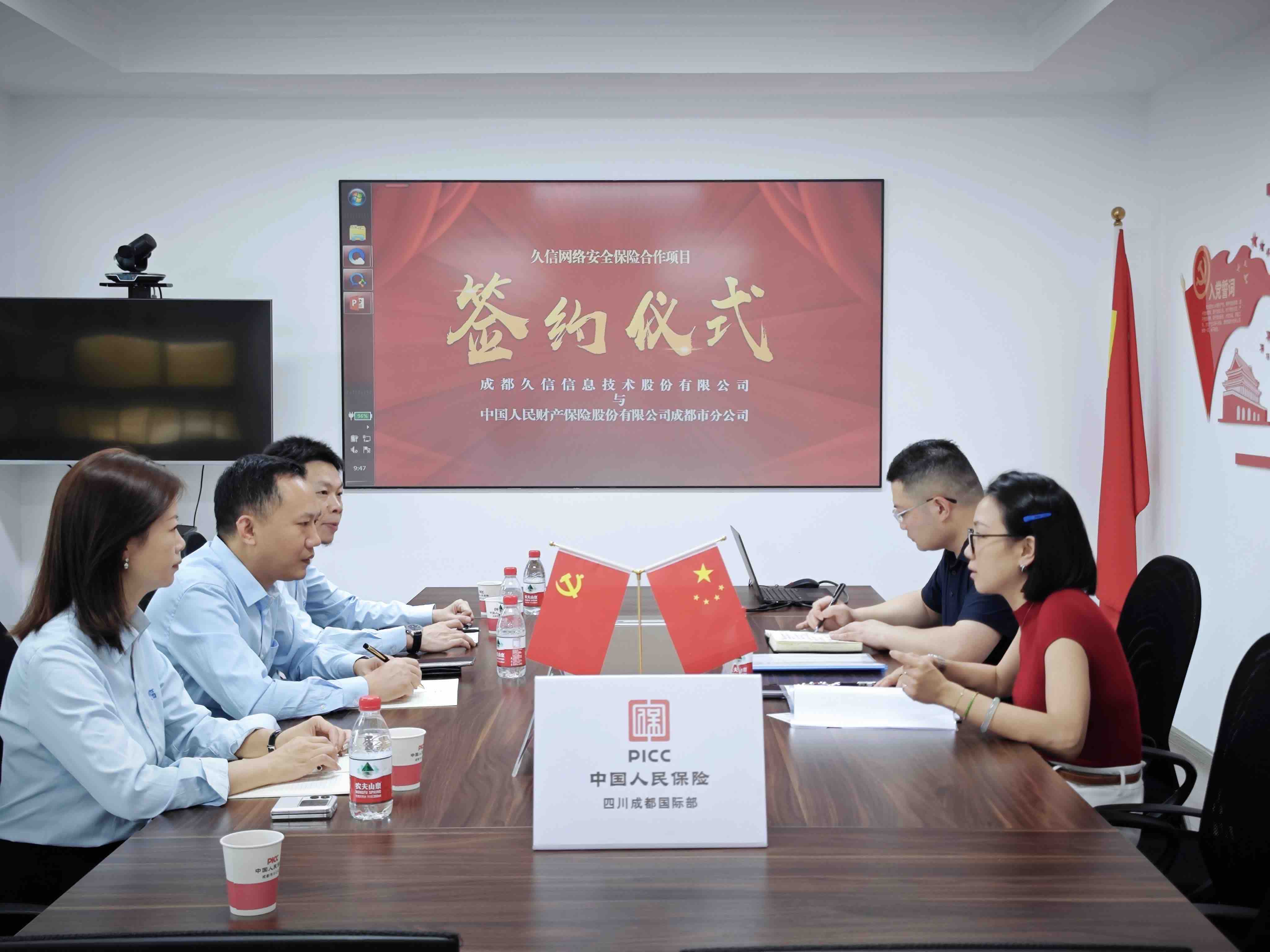 为积极响应工业和信息化部、国家金融监督管理总局联合发布的《关于促进网络安全保险规范健康发展的意见》,加速网络安全保险创新模式的落地实施,并有效提升企业应对网络安全风险的能力,2024年8月27日,成都久信信息技术股份有限公司与中国人民财产保险股份有限公司成都市分公司正式签署合作协议,共同开启网络安全保护新篇章。久信股份董事长任朋飞先生出席本次会议,高层管理人员陪同参加。