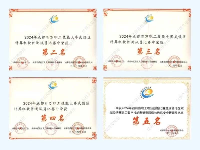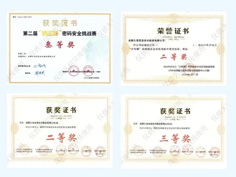 在四川技能大赛-2024年四川省工业和信息化技术技能大赛、泸永江“泸有麒”杯网络安全攻防演练、乐山•攀枝花网络安全实战攻防联合演练、川渝藏七地网络安全实战玫防、成都百万职工技能大赛武侯区计算机软件测试员竞赛、成渝地区双城经济圈职工数字技能邀请赛等多项赛事上久信股份均荣获佳绩。每项荣誉,都是对久信人精湛技艺与团队精神的最佳诠释。