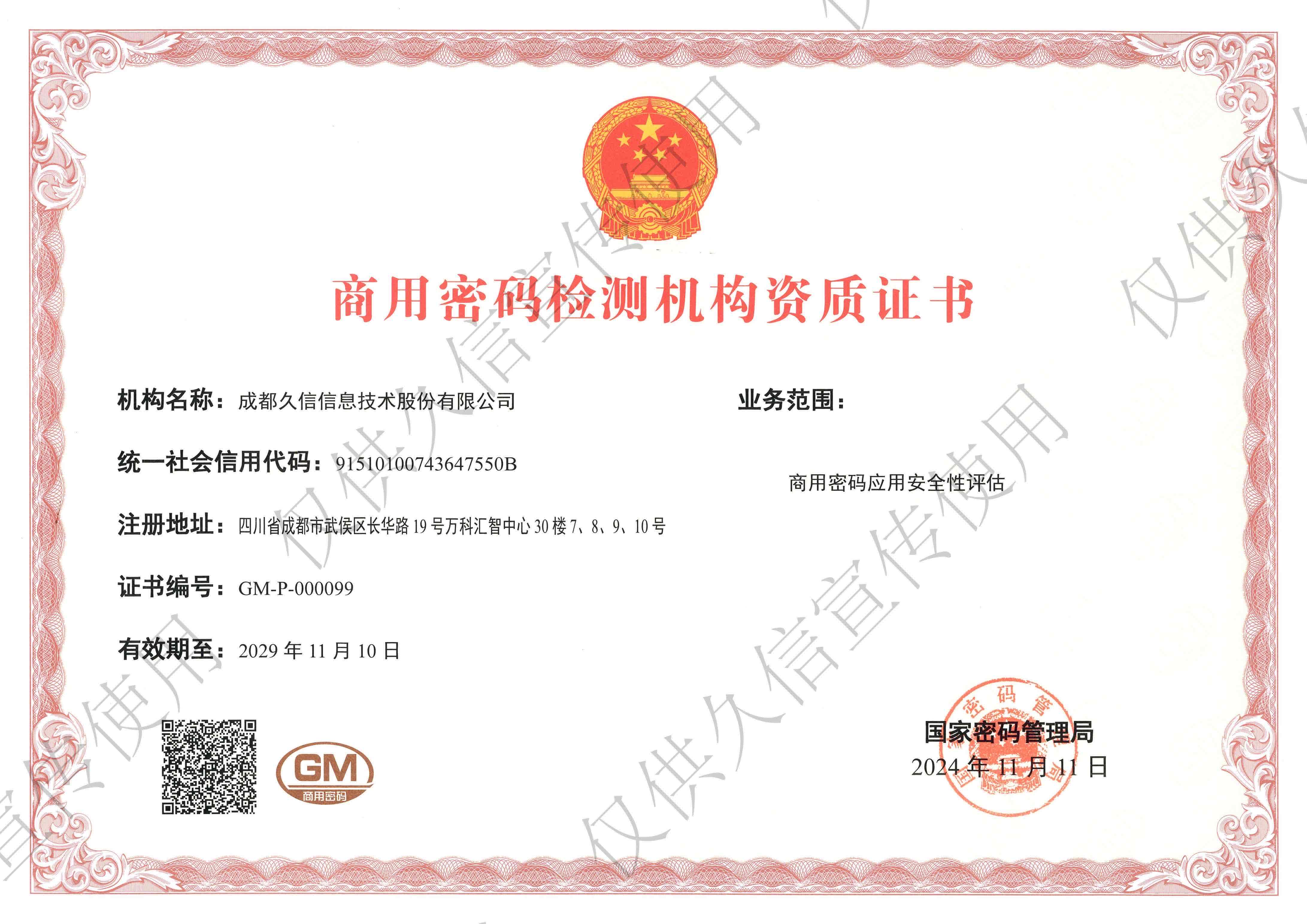11月11日,国家密码管理局公布《商用密码检测机构(商用密码应用安全性评估业务)目录》,久信股份荣获商用密码检测机构(商用密码应用安全性评估业务)资质。此番资质的官方授予,是久信股份长达两年精心筹备与不懈努力的结果。期间,公司全体员工严格对照相关验收标准,以高标准严要求推动各项整改工作,最终从170余家单位中选拔通过。久信股份将紧密贴合相关政策导向,持续深化商用密码在信息技术领域的创新应用,助力推动行业安全健康发展。