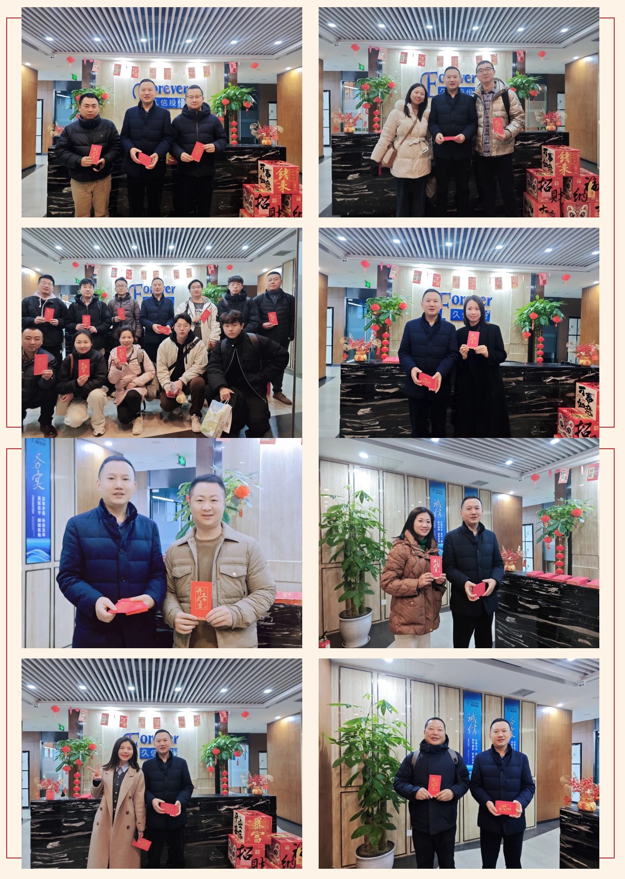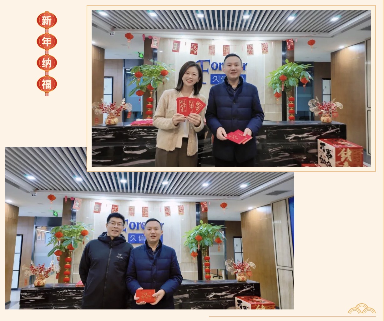 一早,久信股份董事长任朋飞先生便早早守候在公司大门前,精心布置了新年装饰,营造了浓厚的开工氛围。他为每一位久信家人送上真挚的祝福和红包,让员工深切感受到公司的关怀与温暖,增强了大家的归属感和凝聚力。
