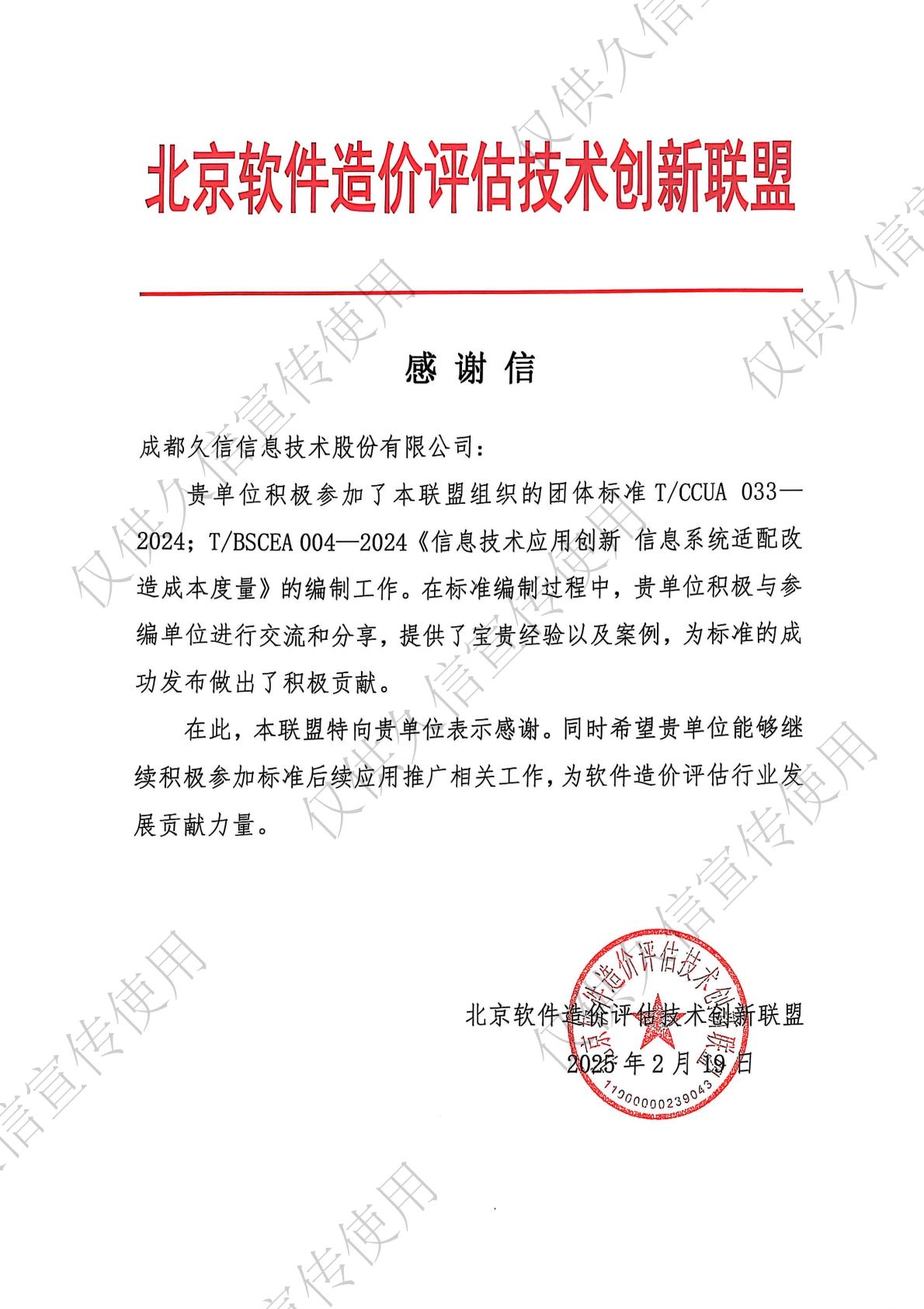 同时,北京软件造价评估技术创新联盟来信致谢,认可我司参与《信息技术应用创新 信息系统适配改造成本度量》等标准编制的贡献。