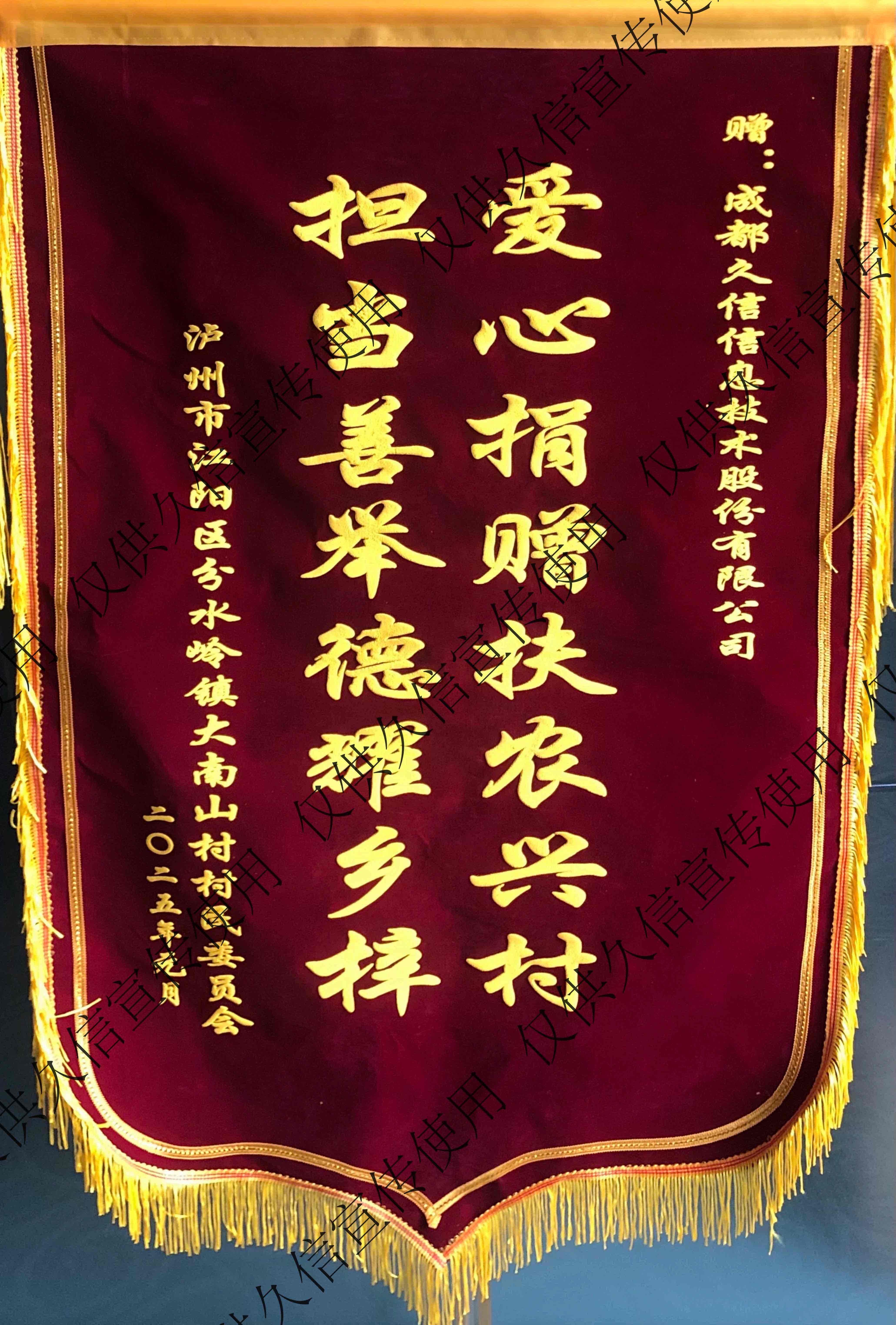 久信股份本季度获多方赞誉:泸州市江阳区分水岭镇大南山村赠锦旗,感谢我司在大南山村开展的定点帮扶工作,该工作对推动当地乡村振兴起到了积极作用。