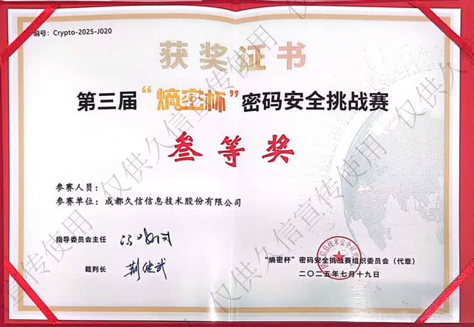 作为国内领先的专业商用密码检测机构,久信股份在此次高规格赛事中再创佳绩,连续两年荣获此奖项,本次大赛在205支参赛队伍中排名20名,不仅是对久信团队专业实力的高度肯定,更是对其深耕密码安全领域、推动行业发展的最佳印证。