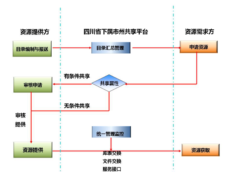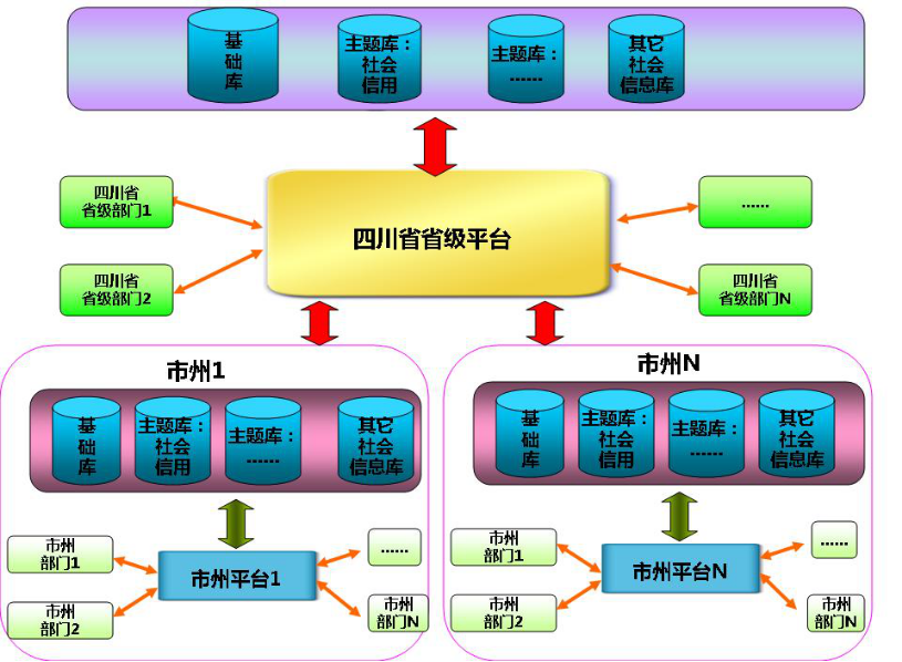 各市州平台横向连接本级各业务部门,纵向往下汇聚连接本市州下属各区县行政部门,纵向往上连接四川省级平台、进而再通过省级平台连接国家平台,从而形成‘市、省、国’三级联动的全域信息资源共享平台。
