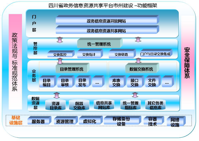 市州共享平台(政务外网)定位为目录中心、资源中心、交换中心、统一管理中心。目录中心汇聚本市州的政务信息资源目录,支撑基于资源目录的共享交换工作。资源中心实现归集到市州共享平台的政务信息资源的加工、处理与集中管理。交换中心提供集中的共享交换服务,支持库表、文件、服务接口三种数据共享交换方式。统一管理中心对市州内所有平台内交换资源进行统一监控和调度。平台核心框架为“五横两纵”的体系架构,具体如下图所示,两纵分别是:“政策法规与标准规范体系”和“安全保障体系”。五横分别是:“基础设施层”、“数据资源层”、“业务层”、“管控层”、“门户层”。市州平台建设******内容应包括:标准规范、资源门户、数据交换系统、目录系统、统一管理系统、安全保障、基础设施等子系统。