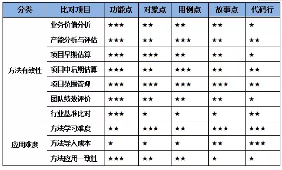 在软件研发成本度量(包括估算与测量)方面,对于软件规模本身的评价是首要任务。根据软件行业的实践,目前评价软件规模的方法主要分为两种:基于业务视角和基于开发视角。基于业务视角的方法是从用户角度出发,与软件开发技术无关,如:功能点、故事点、用例点、对象点等方法;基于开发视角的方法是从*********角度出发,如:基于软件源代码行、数据库表、函数数量等方法。