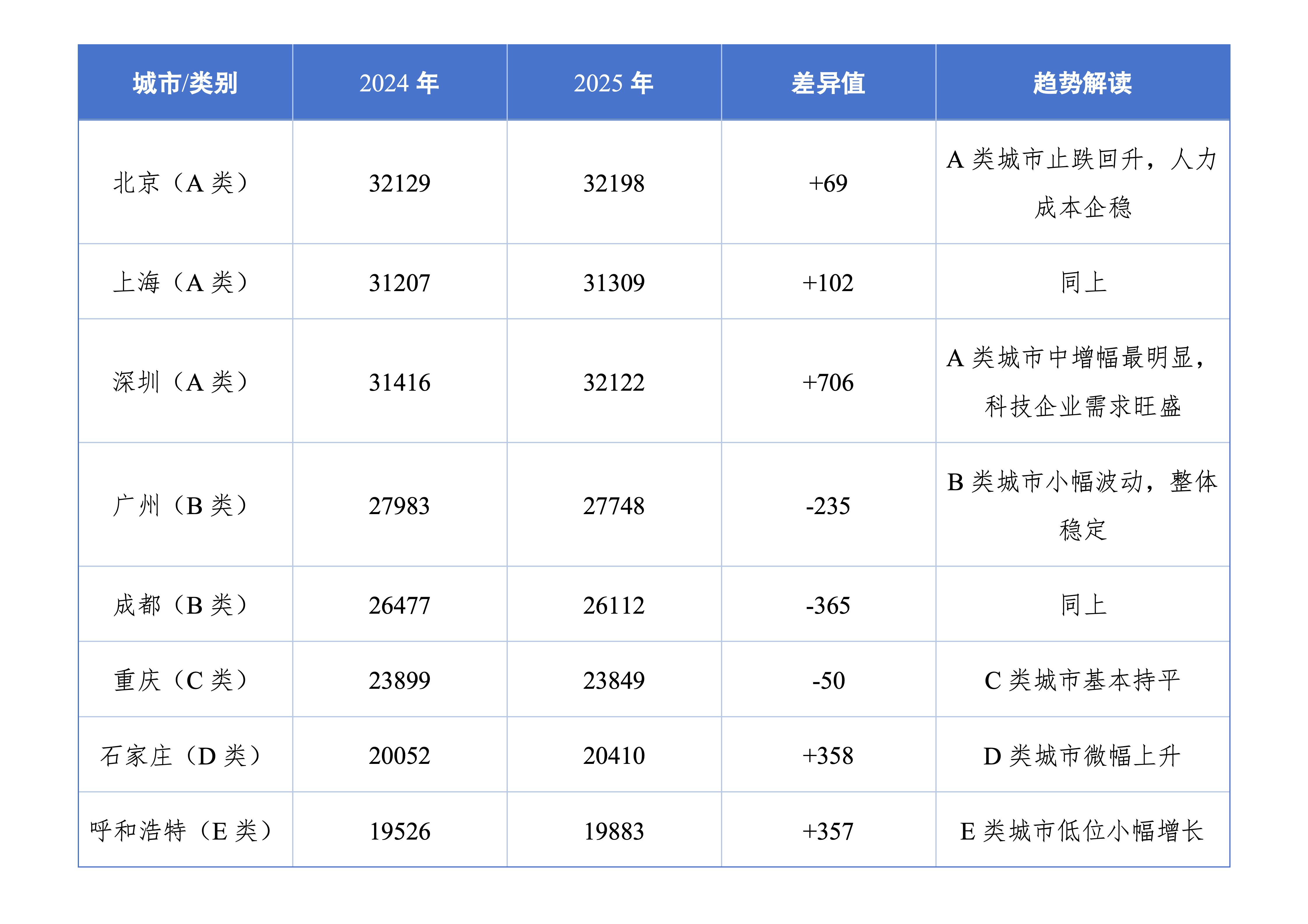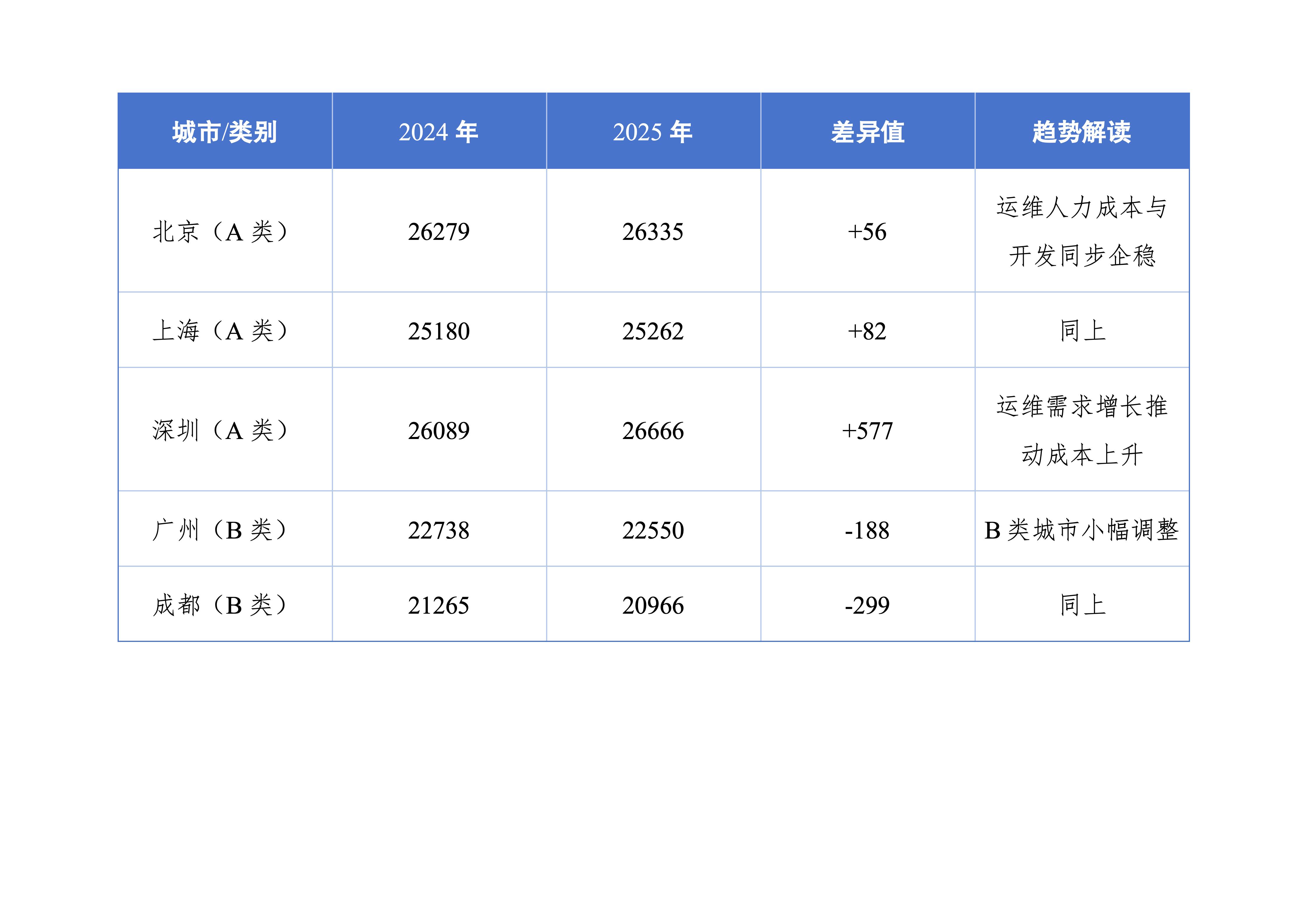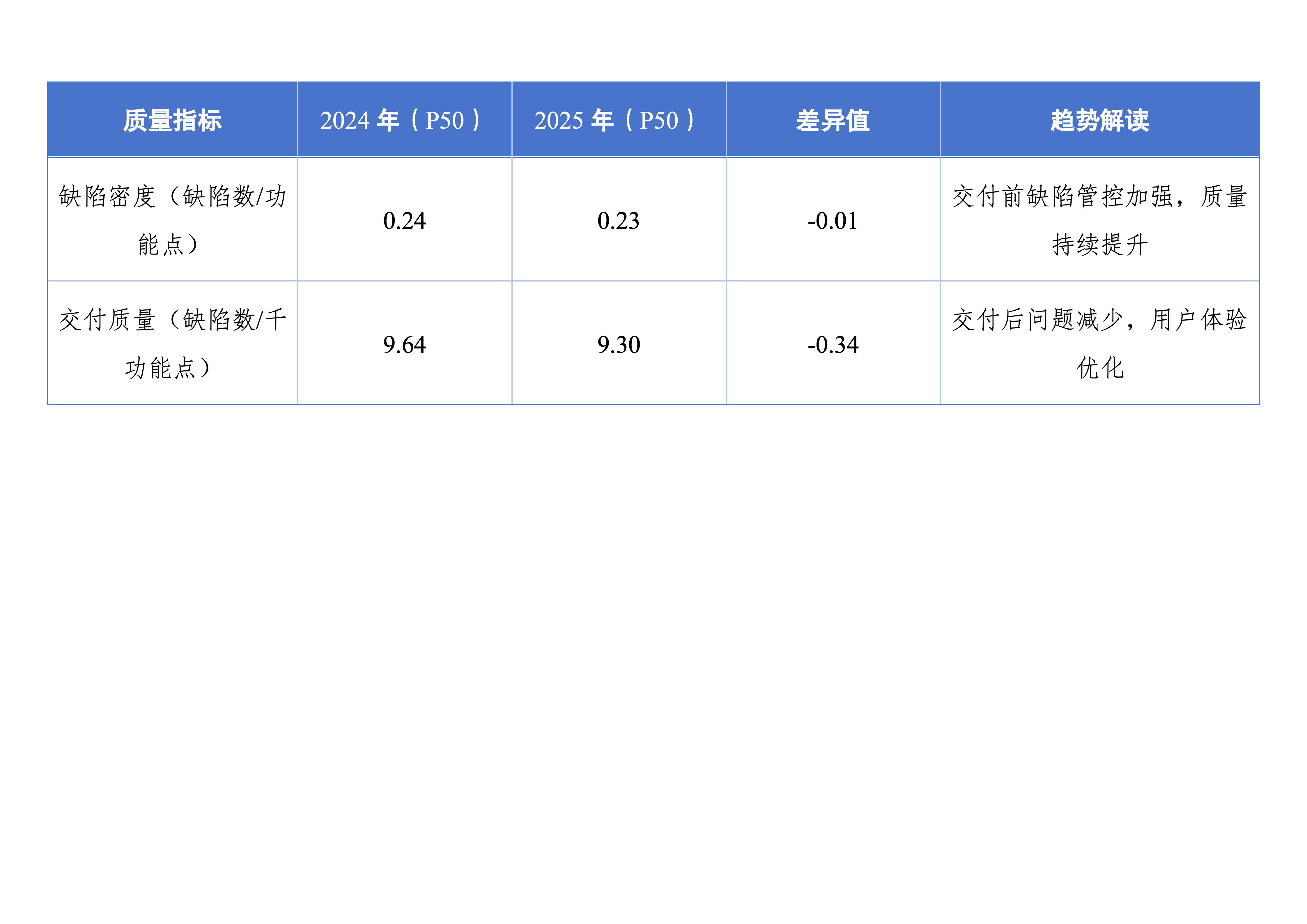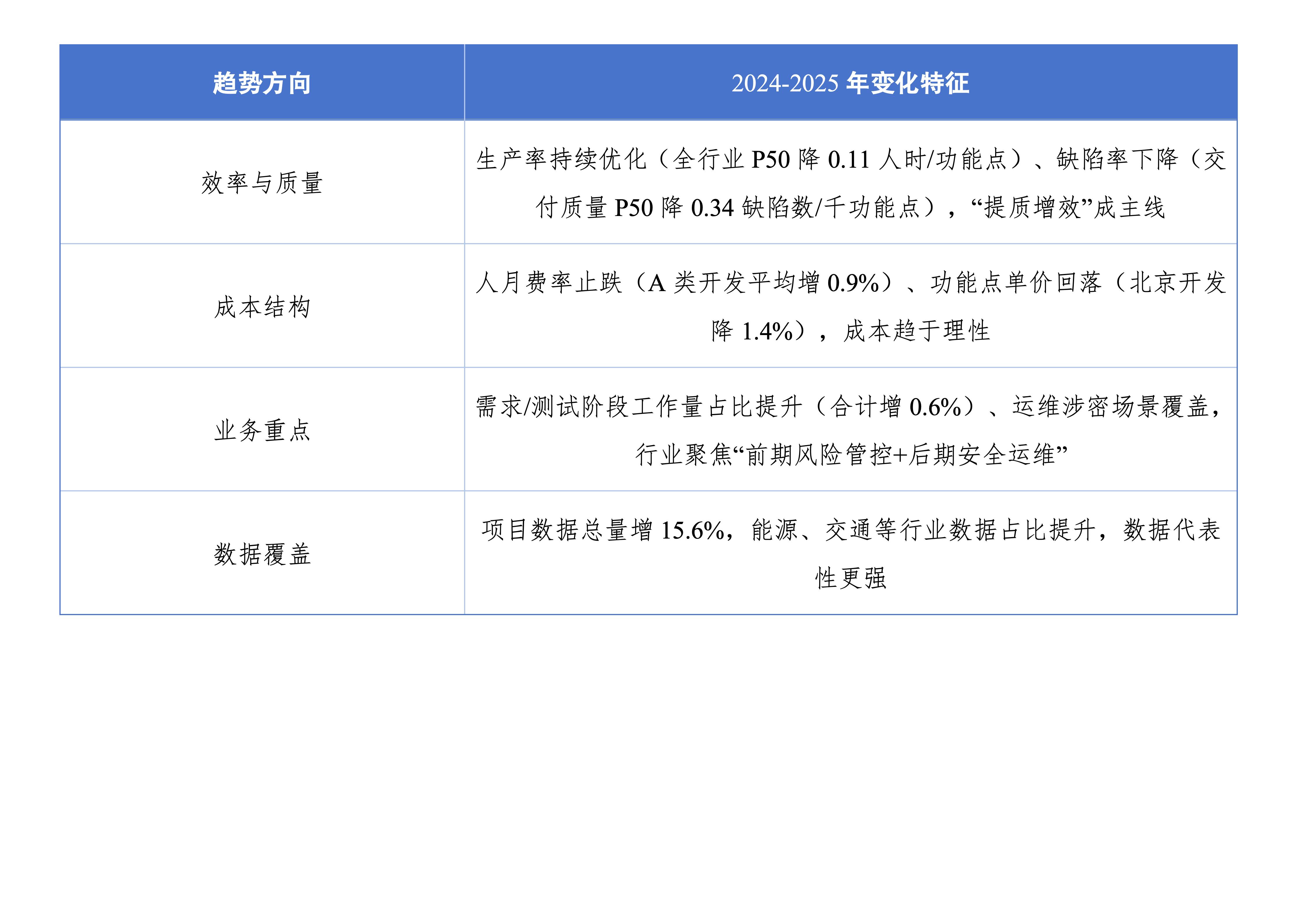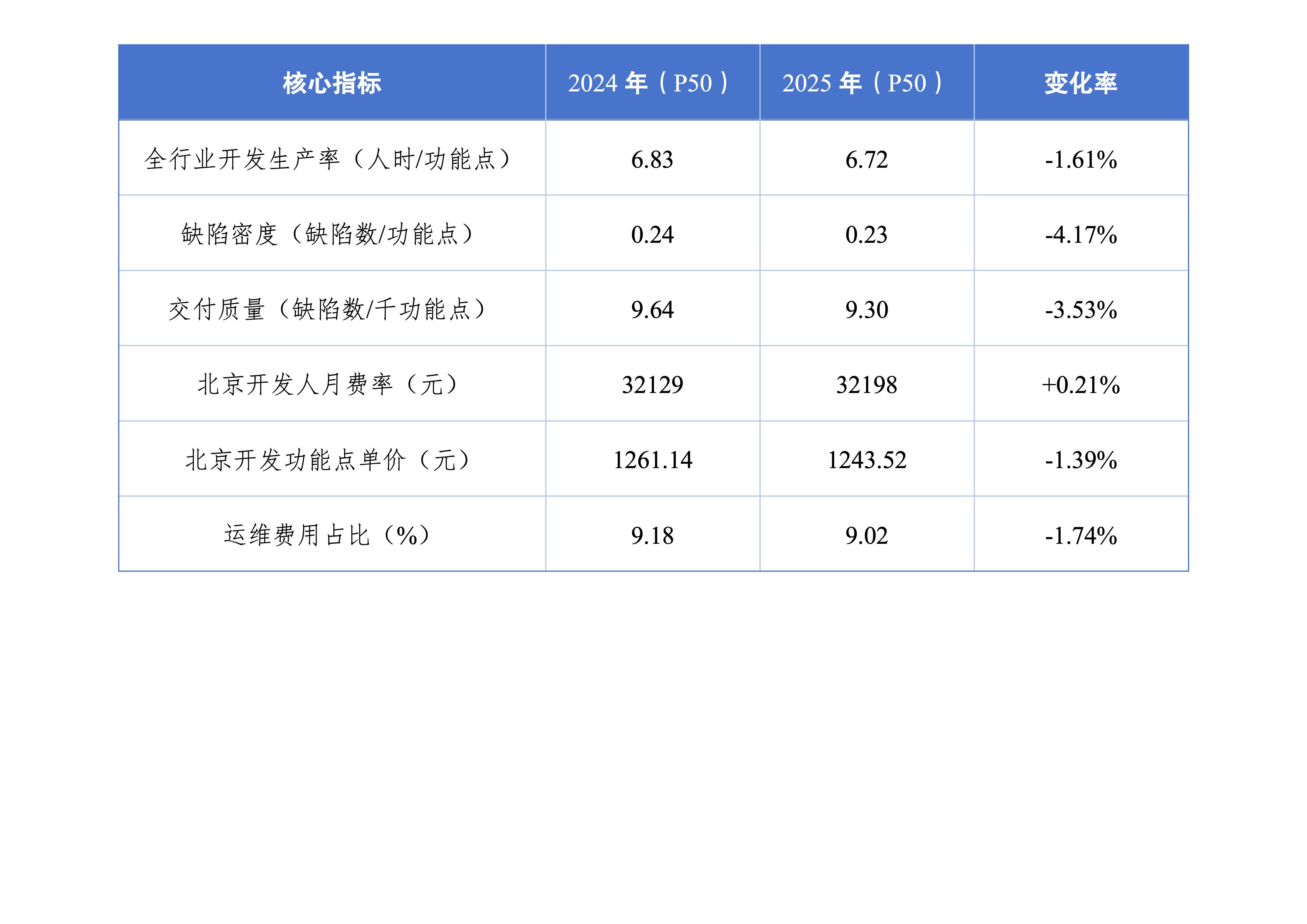 核心技术指标呈现显著优化趋势:全行业软件开发生产率P50值降至6.72人时/功能点(同比降1.61%),电子政务、金融等重点领域效率稳步提升,仅能源行业因系统复杂度增加略有上升;软件质量持续改善,缺陷密度P50值降至0.23缺陷数/功能点(同比降4.17%),交付后问题发生率同步下降3.53%。成本结构趋于理性,A类城市软件开发人月费率止跌回升(北京、上海、深圳分别同比增0.21%、0.33%、2.25%),而北京地区功能点单价同比回落1.39%,反映市场竞争更趋成熟。