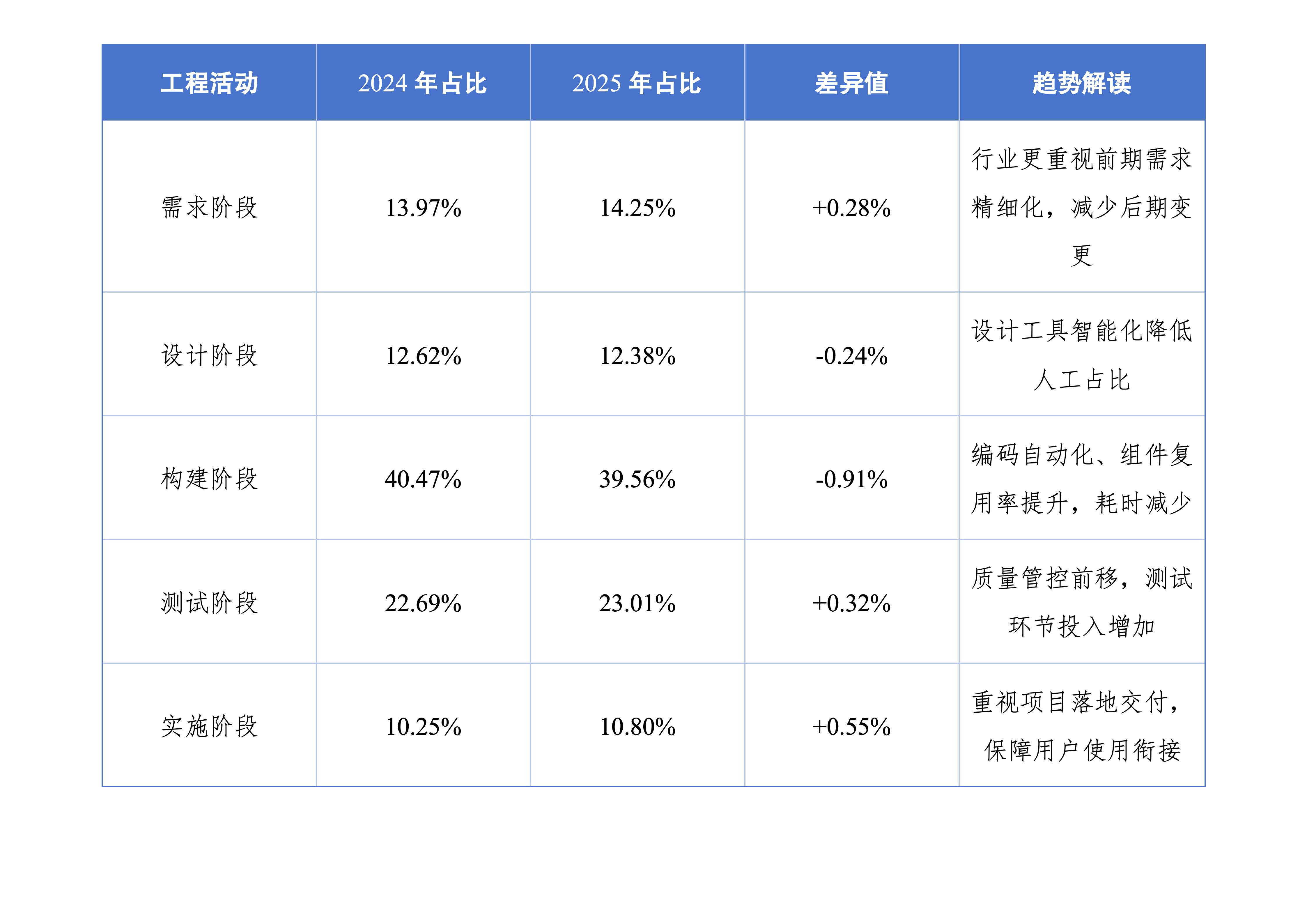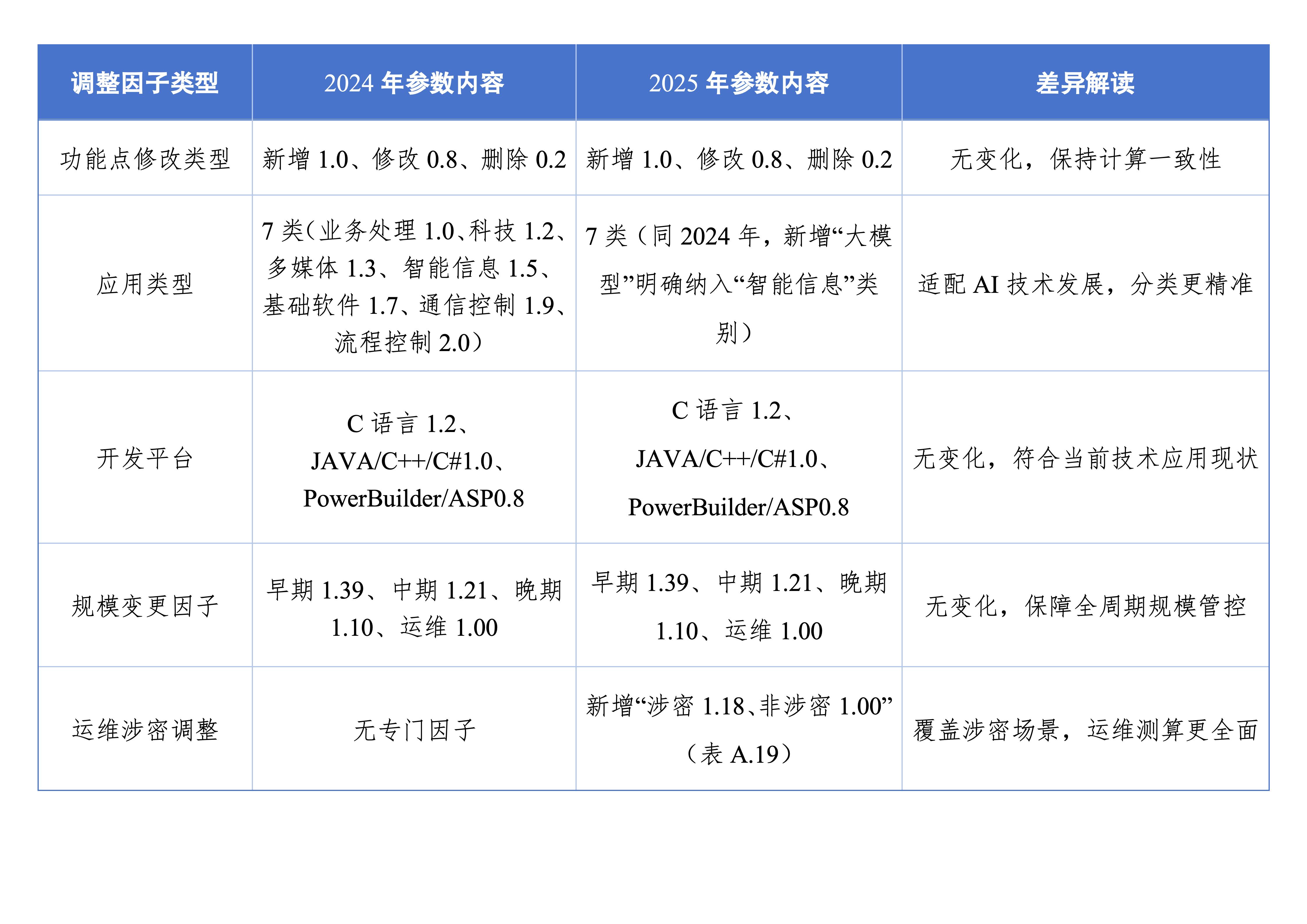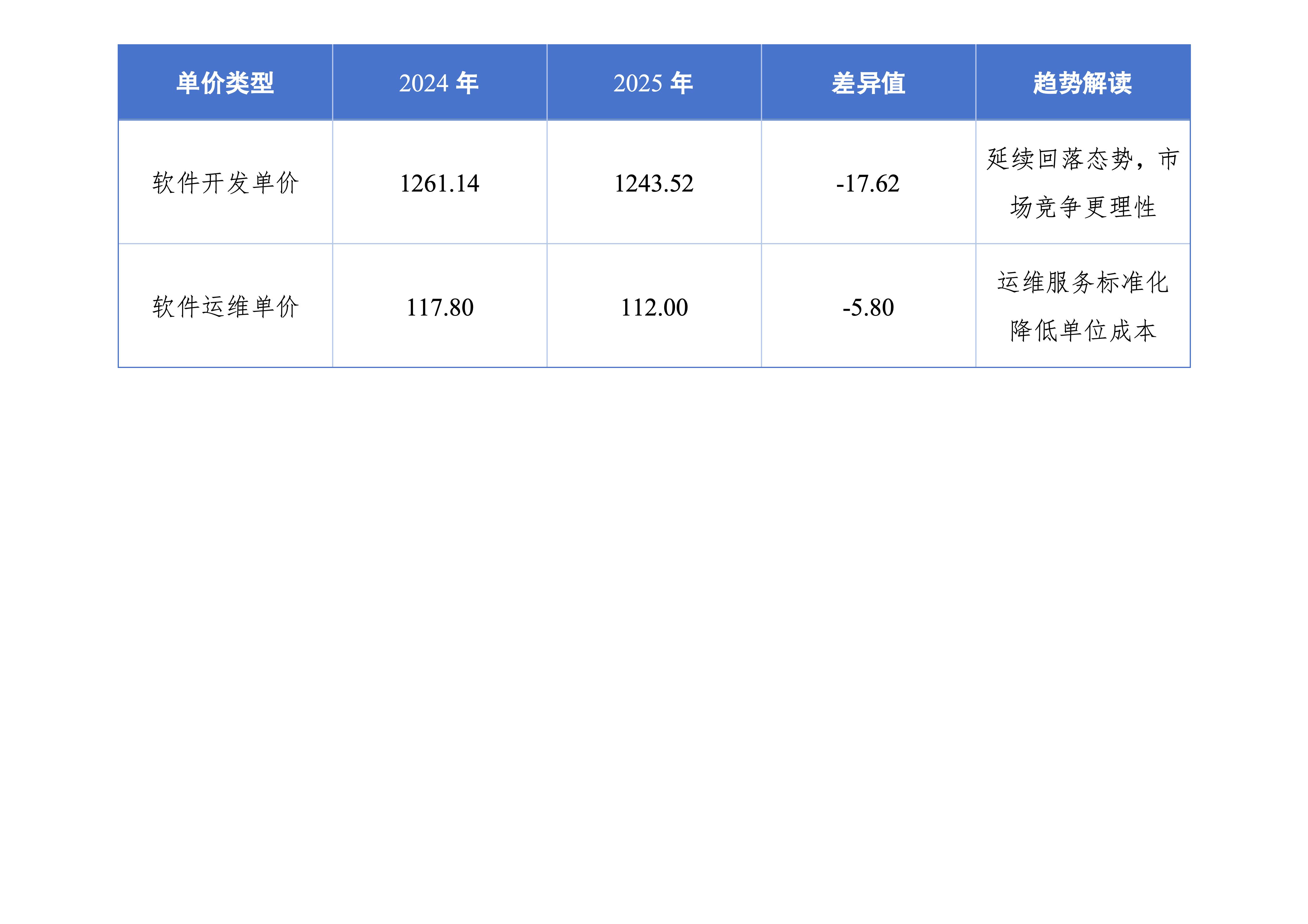 技术流程与度量体系适配行业升级需求:软件开发工作量分布呈现“前重后优”特征,需求阶段(+0.28%)、测试阶段(+0.32%)占比提升,构建阶段(-0.91%)因自动化与组件复用率提升占比下降;成本度量体系新增“大模型纳入智能信息类”“涉密运维调整因子(1.18)”等参数,数据样本周期更新至2020.9.1-2025.8.31,交叉验证机制强化可信度。