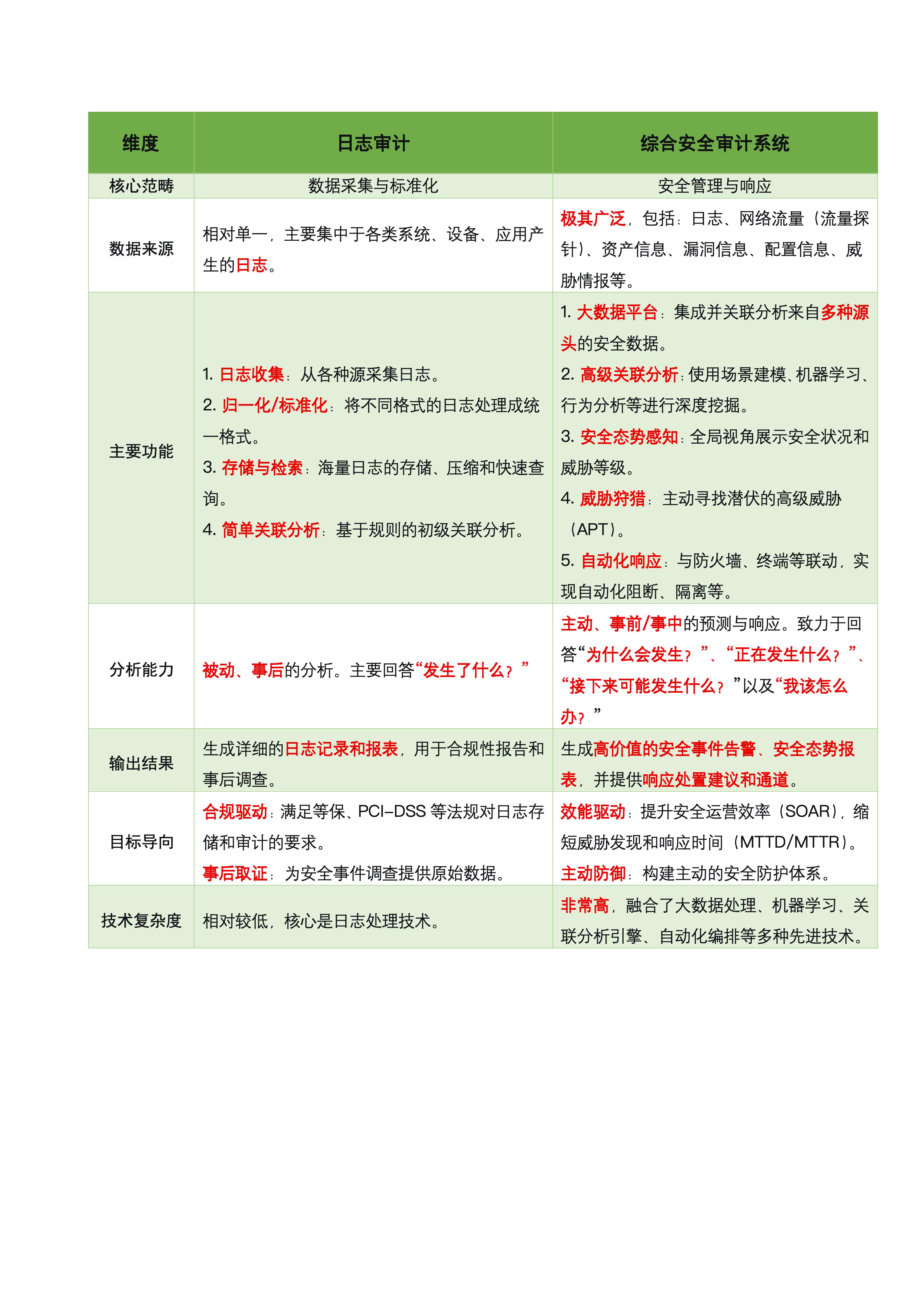 演进关系:日志审计是基础,是原材料的收集和初步整理;综合安全审计系统是上层建筑,是对原材料进行深度加工、提炼出情报并做出决策的大脑。