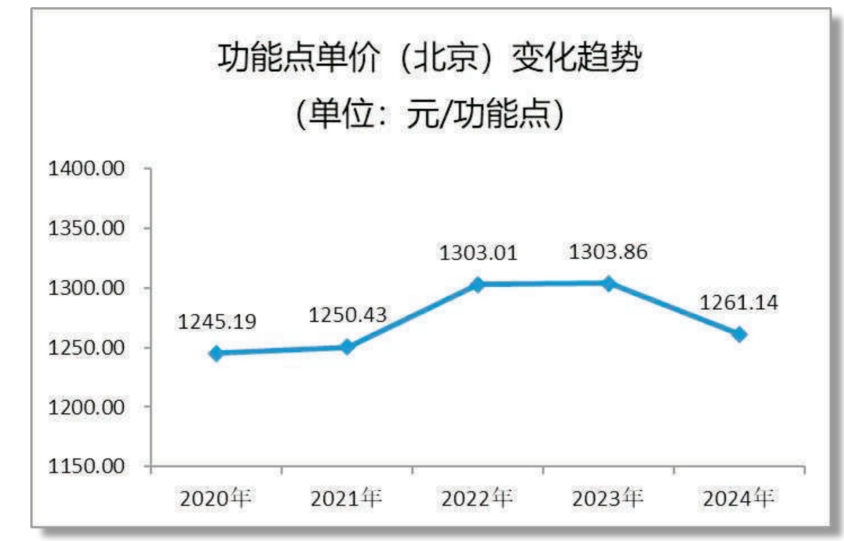 近五年来,软件开发功能点单价呈现出先上升后下降的变化特征。以北京市为例,在经历了 2022 和 2023 年相对较高的功能点单价之后,2024 年的功能点单价已回落到与 2020、2021 年大体相当的水平。这一价格波动趋势反映了市场供需关系、技术发展水平以及行业竞争状况等多种因素的综合作用,为软件项目的投资决策和成本核算提供了重要参考。