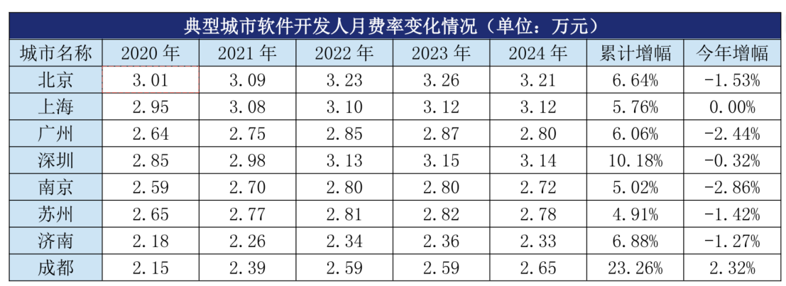 人月费率的整体态势及变化趋势对于行业成本结构影响显著。当前,人月费率呈现出整体增长的趋势,但值得注意的是,近年来各类城市人月费率的增幅已经明显放缓。尤其自 2023 年开始,人月费率出现负增长的城市数量逐步增多。这种变化情况对于软件企业的人力资源成本管理、项目预算制定以及市场竞争策略都将产生深远影响,企业需要密切关注并合理应对。