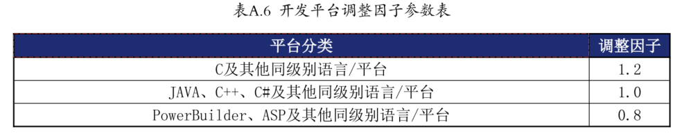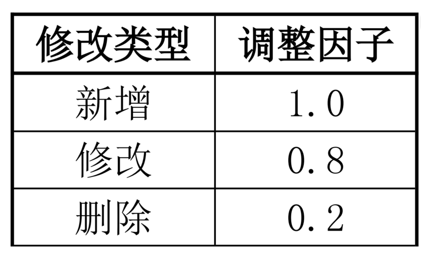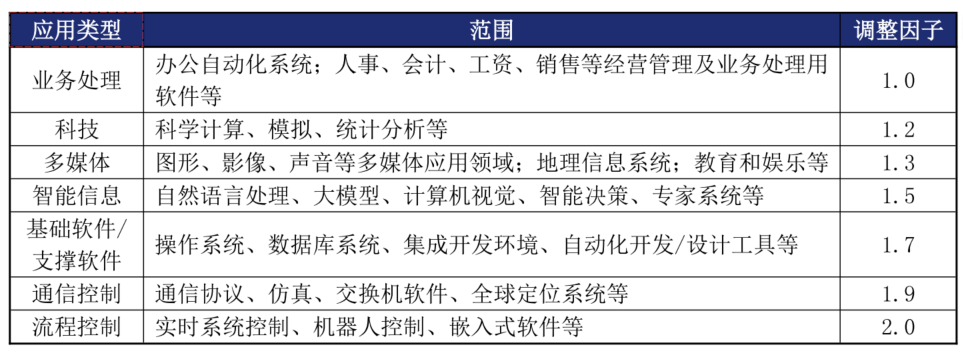 2)该表由 7 项调整为 6 项,其中减少了软件集成的调整因子。这种调整反映了在当前软件应用场景和技术架构下,对于软件集成环节在工作量评估中权重的重新考量,促使成本度量更加贴合实际情况。
