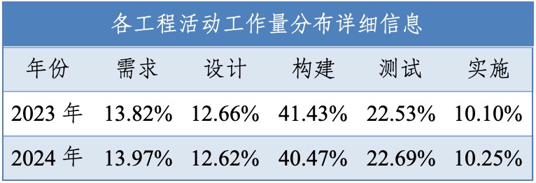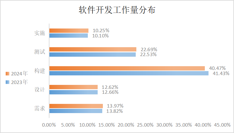 在软件工作量分布方面,出现了结构性变化。其中,需求、测试、实施阶段的工作量占比相对于 2023 年有所提高,而设计、构建阶段的工作量占比则相对下降。这种变化反映出软件开发商在项目实施过程中的策略调整。对需求环节的重视,有助于更精准地把握用户需求,减少因需求不明确导致的后期变更成本;加强测试工作能有效提高软件的稳定性和可靠性;而在实施阶段投入更多精力,则可保障软件顺利部署和应用。同时,设计和构建阶段工作量的相对减少,意味着软件开发商在技术成熟度方面取得了进步,能够以更高效的方式完成这两个阶段的工作。